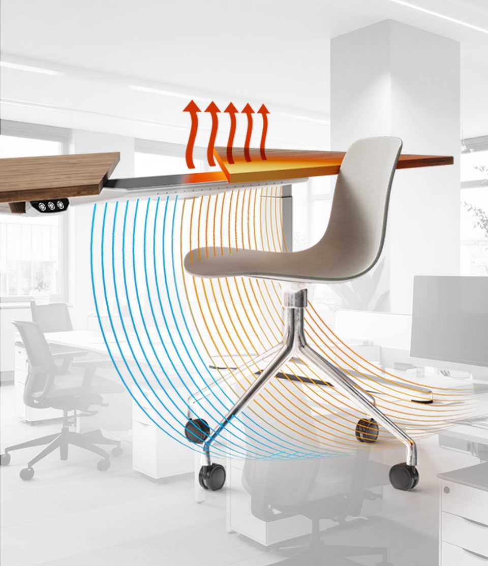 3in1 | TischKlima – energieeffiziente Schreibtischheizung im Winter und erfrischende Kühlung im Sommer. Jede Arbeitsplatzzone ist individuell regulierbar mit fünf Heizstufen für Beine und Füße sowie einstellbarer Strahlungs- und Kontaktwärme.